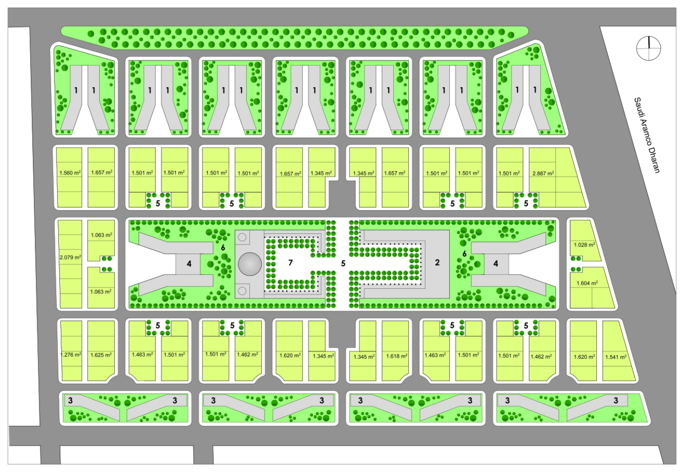 For Bin Quraya Group, we designed a campus on the edge of Dahran, a coastal city on the Persian Gulf. A Campus is a closed village for foreigners and wealthy locals, enjoying all the facilities of a community life. The campus includes 137 villas, 6,000 m2 of offices in 7 twin towers, a school, a cultural center and a mosque, a shopping and sports center