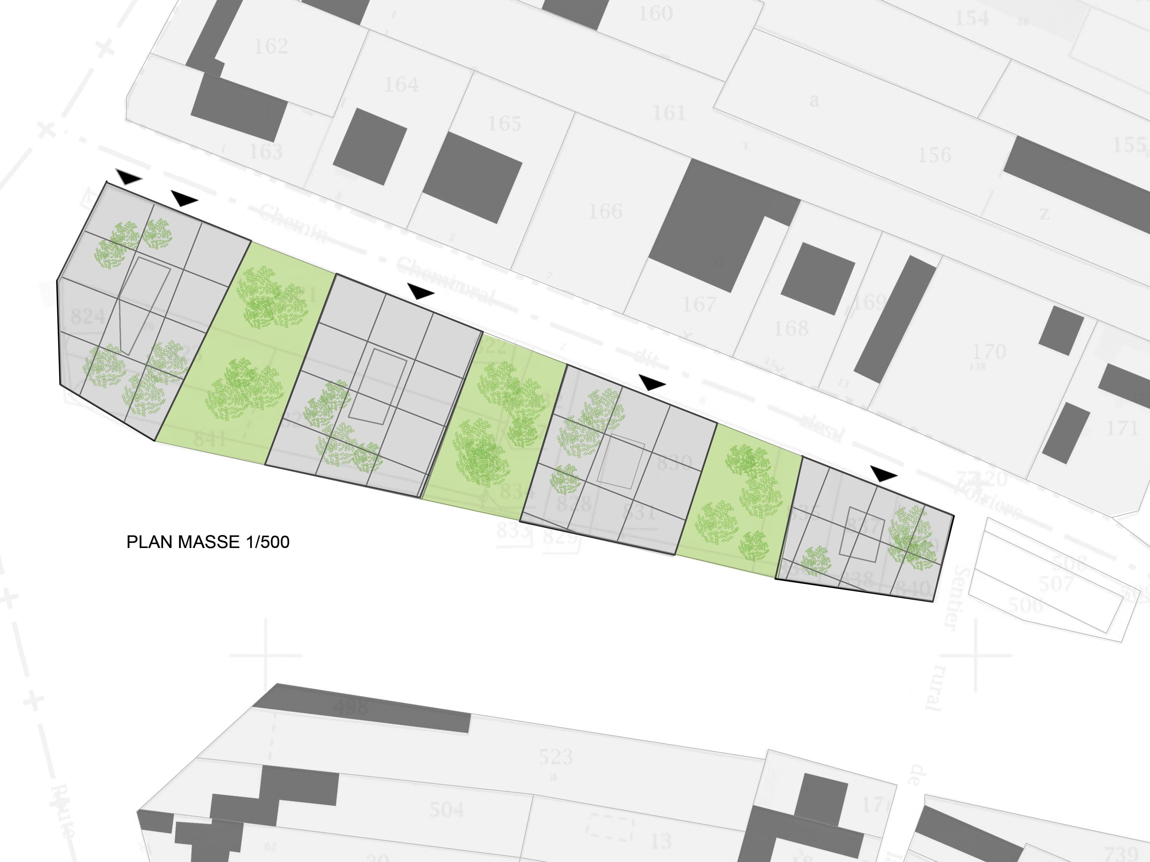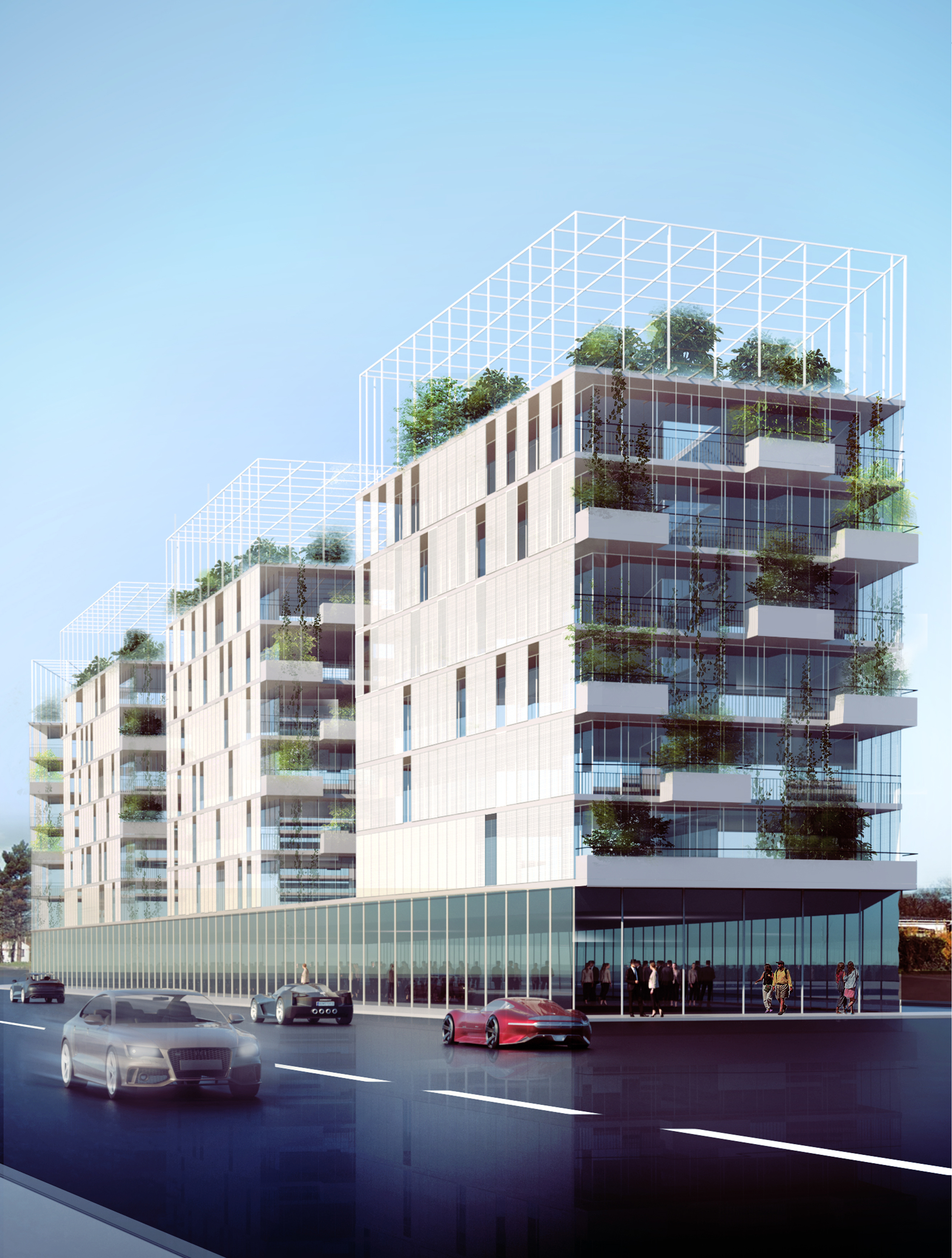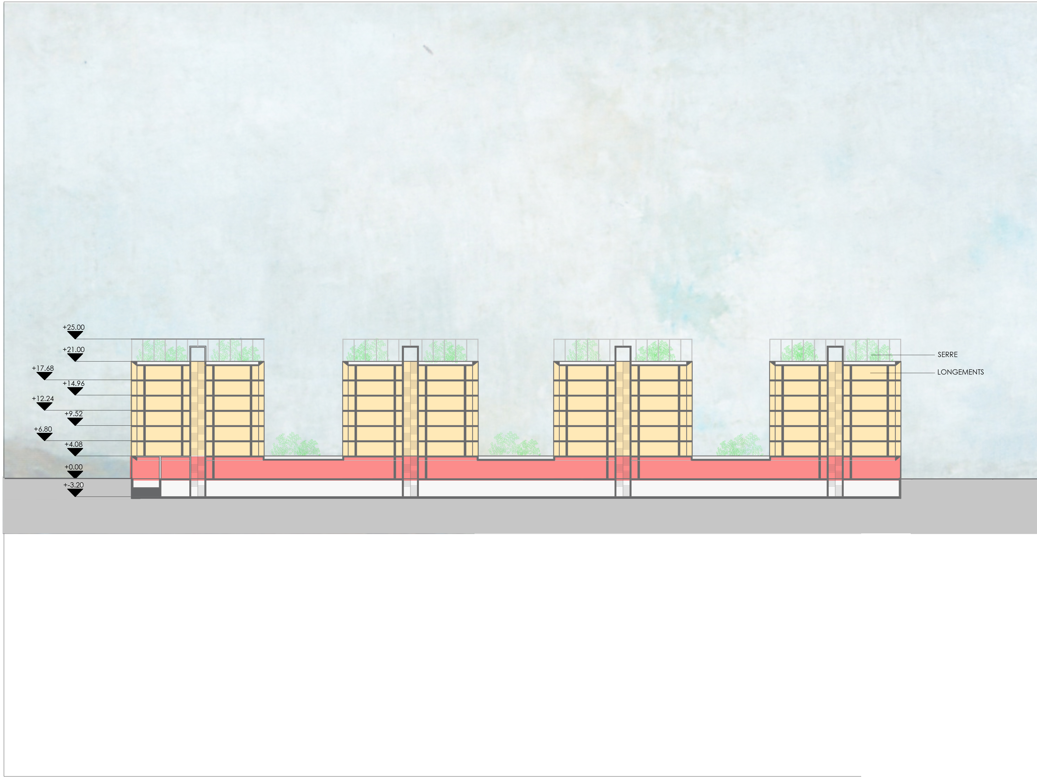 A single slab situated on the ground level with commerce and parking connects the 4 towers of 6 floors each above. The ground floor volume follows the site's form. Inside the towers, all the dwellings are double-oriented. The passageways of the terraces are closed with sliding aluminum shutters on the street side and open East-West, with planters whose alternating position facilitates lighting. On the roofs, tall greenhouses shelter vegetable gardens.